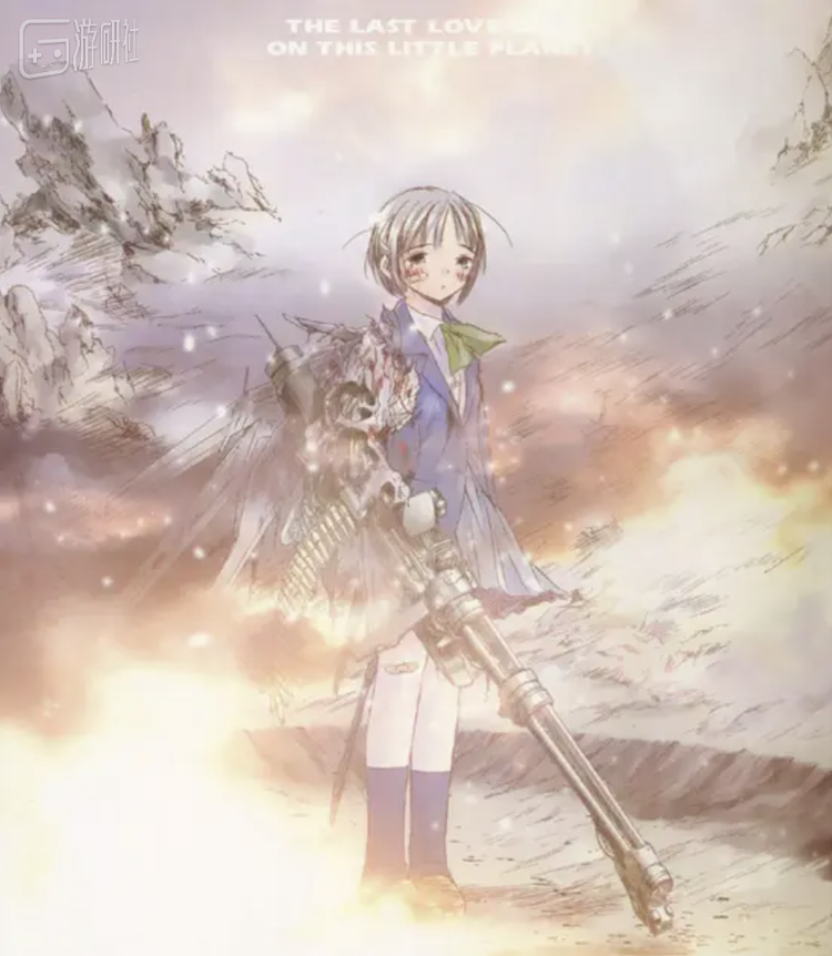 巨大的美感瞬间击中了我,它绝对不是简单的“反差萌”或者“男性喜欢的两样东西叠加”。学生制服的日常感,巨大机枪的异质化,少女的茫然,周围环境的残酷,混在一起,有一种当时我完全不知道该怎么形容、定义的浪漫。