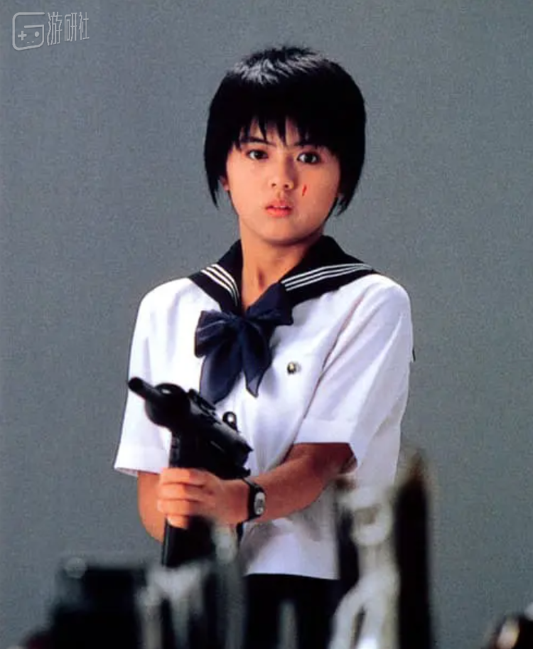 其实在更早之前,日本人就发现了少女和武器有种奇妙的协调感。1981年,黑道题材的电影《水手服与机关枪》震撼过整整一代日本青年男女,很大程度上靠的就是女主角那突破性的造型:拿着手提机关枪的校服少女。