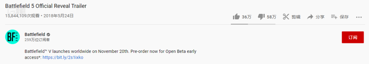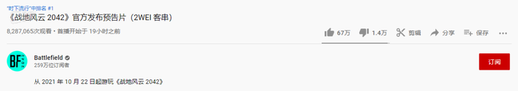 《战地2042》与《战地5》,首部宣传片的Youtube数据对比