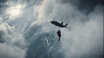 可是做出机动的飞行员,下一步却选择从战斗机中弹射出舱,紧接着拔出一根火箭筒朝紧追其后的敌机射击,敌机被火箭击中,发生爆炸。飞行员进入自由落体状态,顺势抓住了下落速度较慢的飞机,爬进驾驶位,重启发动机,扬长而去。