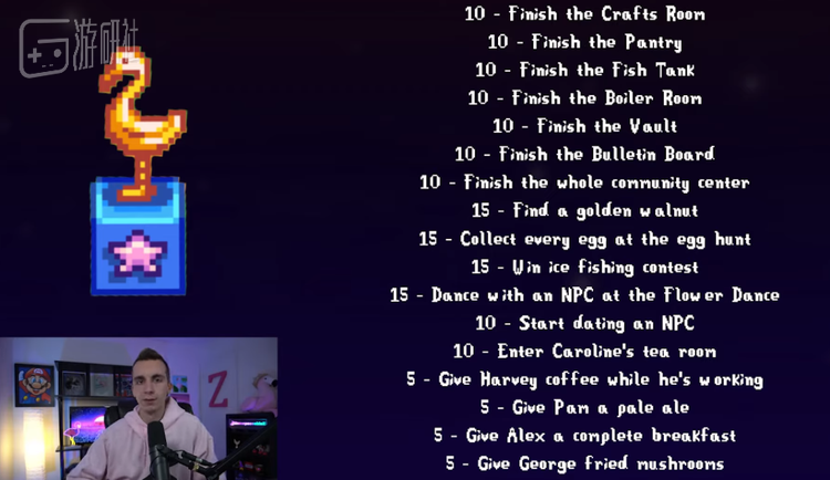 不过既然是电竞比赛,主办方自然也需要指定合适的胜负评定准则,在这次的比赛采取的则是积分赛制。在预告视频中,作者给出了一份非常详细的得分名单,其中包括了:搭建温室、赢得冰钓比赛、约会某个NPC、扩建房屋等。
