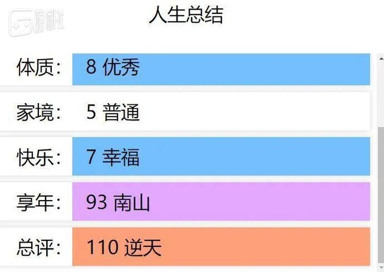 在丧命之后,你会收获一个对于人生的总体评价,活得越久,属性越高,得分越高。