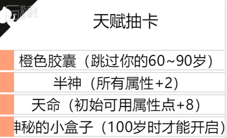 但属性再高,也只是普通人里的天才选手。一般的橙色天赋有1%的几率就可以刷出来。而最重要的天赋,也就是那个“神秘的小盒子”,只有0.1%的几率出现。