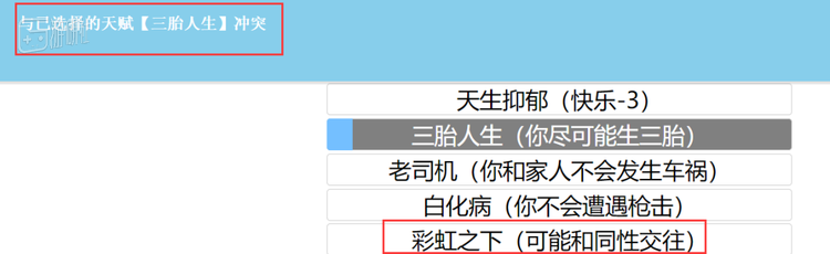 虽然整个游戏流程只是一个条件词条生成器,但《人生重开模拟器》规则和文案的细节也能称之为之严谨,例如“生三胎”与“和同性交往”两个天赋不能同时出现。