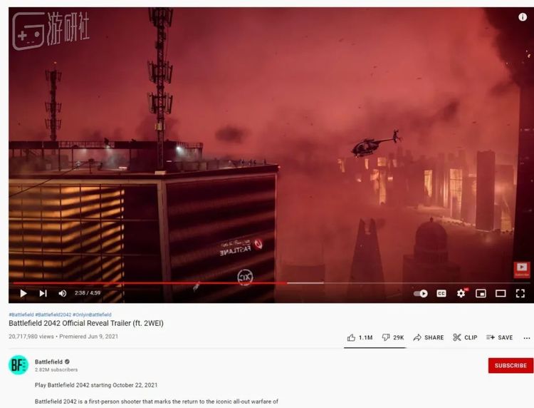 在《战地2042》预告片刚公布的时候,玩家们就对这款游戏充满了期待。预告片2000多万播放量,油管上的好评率超过了97%。相比上一代《战地V》预告片多半差评的争议,其实是一个挺漂亮的翻身仗。