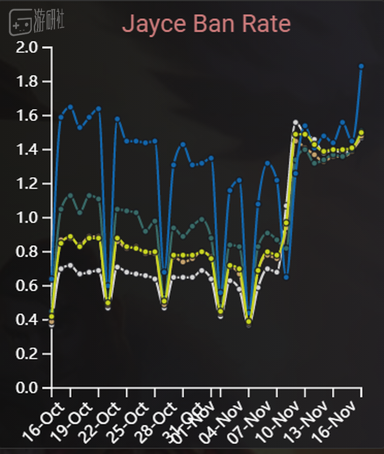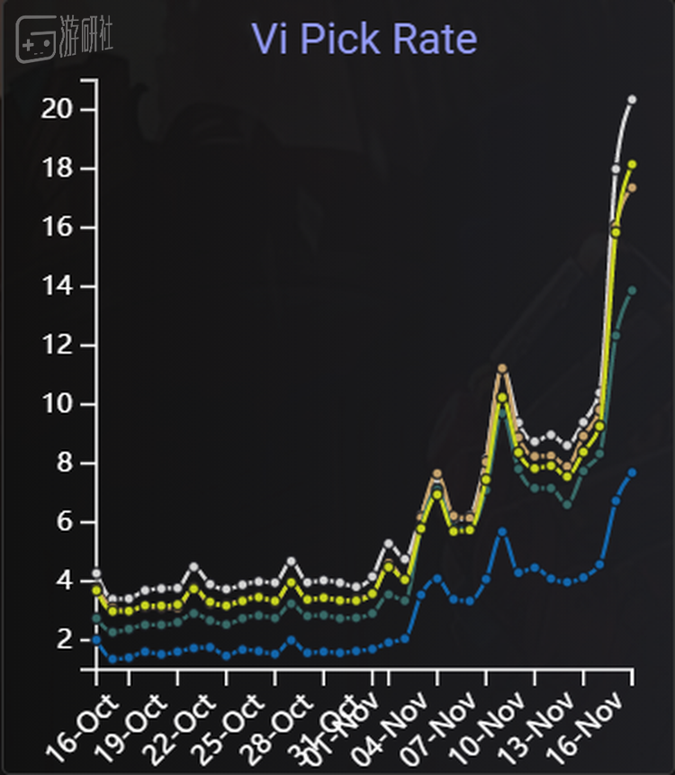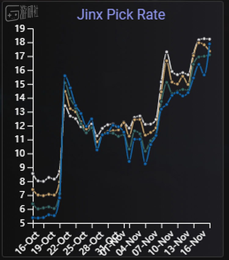 此外除了她俩,几乎所有在动画中拥有一定重要戏份的英雄,如今在游戏中的登场率也都出现了一定程度地上涨。比如杰斯从11月6日的3.7%提升到了11月11日的11.85%,凯特琳也从开播前的15%上涨到了如今的20%。