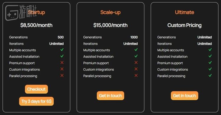在他们的官网上,最低一档的会员每月价格显示为599美元,购买后能生成的模型数量只有30个,每个模型能进行10次修改。就算是标价最高的15000美元每月的会员套餐,依然还有每月1000个模型的数量限制。只有一个“价格面议”的最高档位里,才完全放开了生成模型的数量限制。